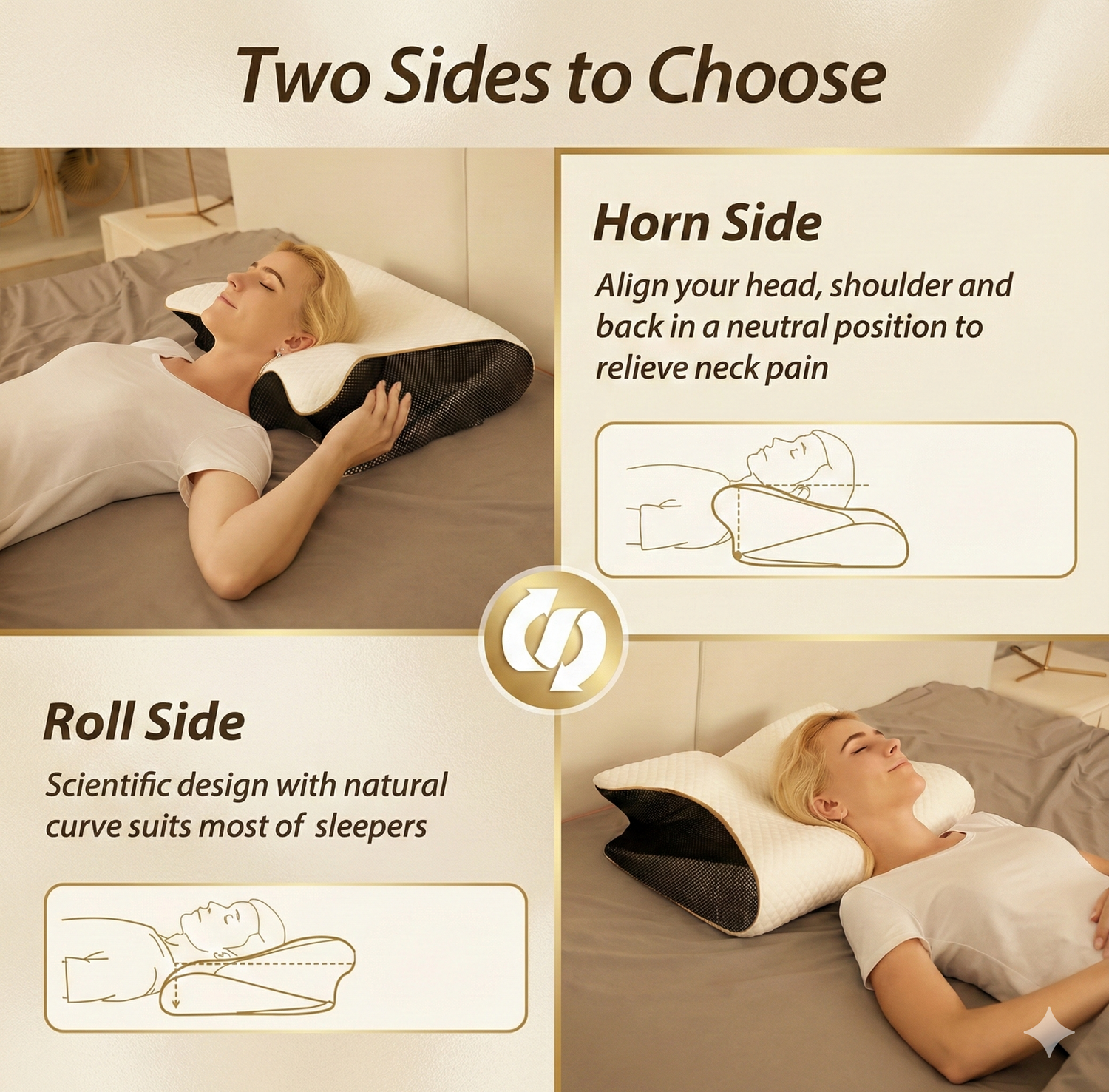 - Horn side: Aligns your neck for pain-free mornings